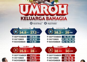 UMROH KELUARGA BAHAGIA – PROMO GILA! Bayar 3 Berangkat 4! Harga mulai 27 JUTA-an aja! Mau ke Tanah Suci bareng keluarga? Inilah saatnya! Promo Terbatas — 3 FREE 1! Hotel Madinah & Makkah Nyama...