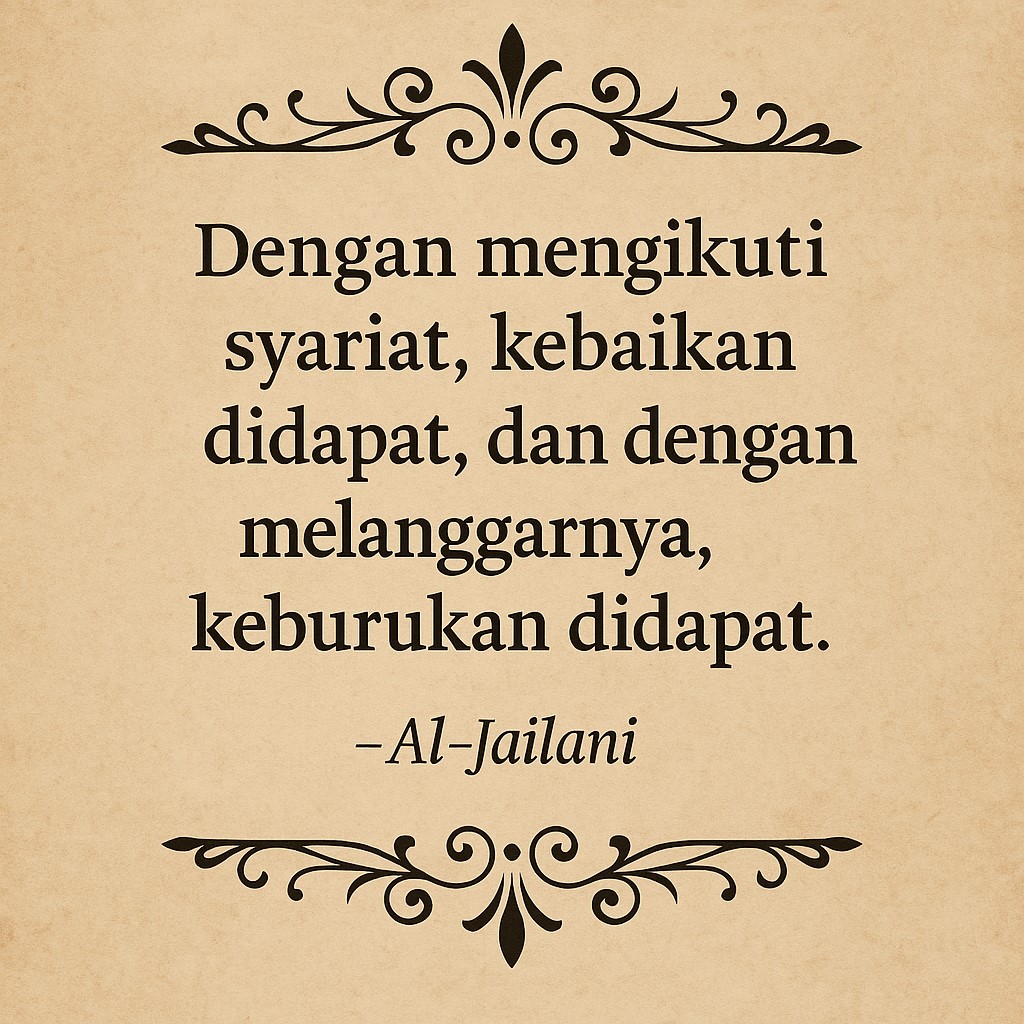 Masya Allah… kalimat ini benar-benar menggugah dan mengandung hikmah yang dalam. Syeikh Abdul Qadir al-Jailani tidak hanya menekankan pentingnya kedekatan dengan Allah, tapi juga mempertegas bahwa syariat adalah jalan keselamatan—bahkan teman seperjalanan menuju Allah.