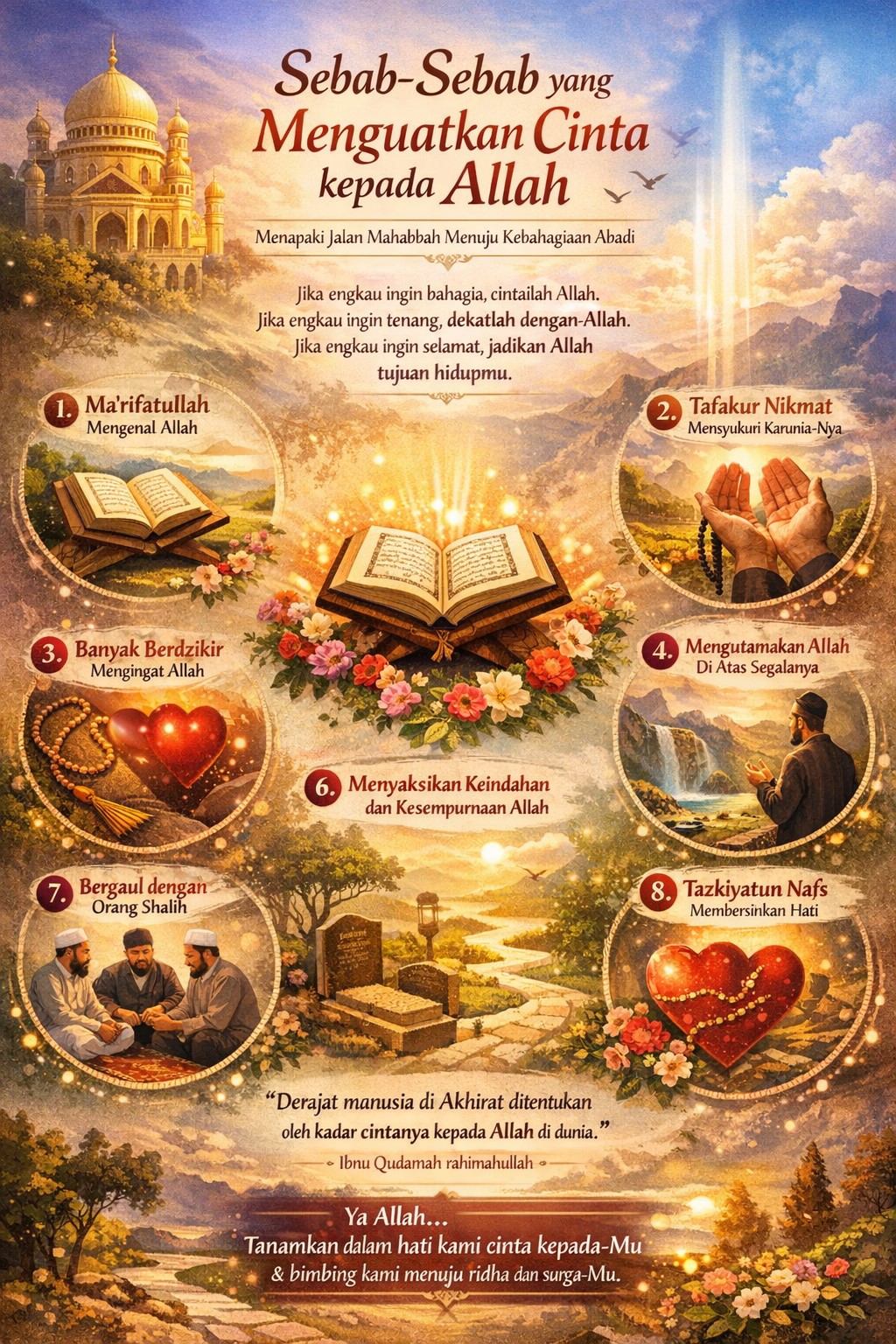 Sebagaimana dijelaskan oleh Ibnu Qudamah dalam karya monumentalnya Minhajul Qashidin, cinta kepada Allah bukan sesuatu yang datang tiba-tiba, melainkan ditumbuhkan melalui sebab-sebab yang harus diupayakan dengan kesungguhan jiwa dan kesucian hati.