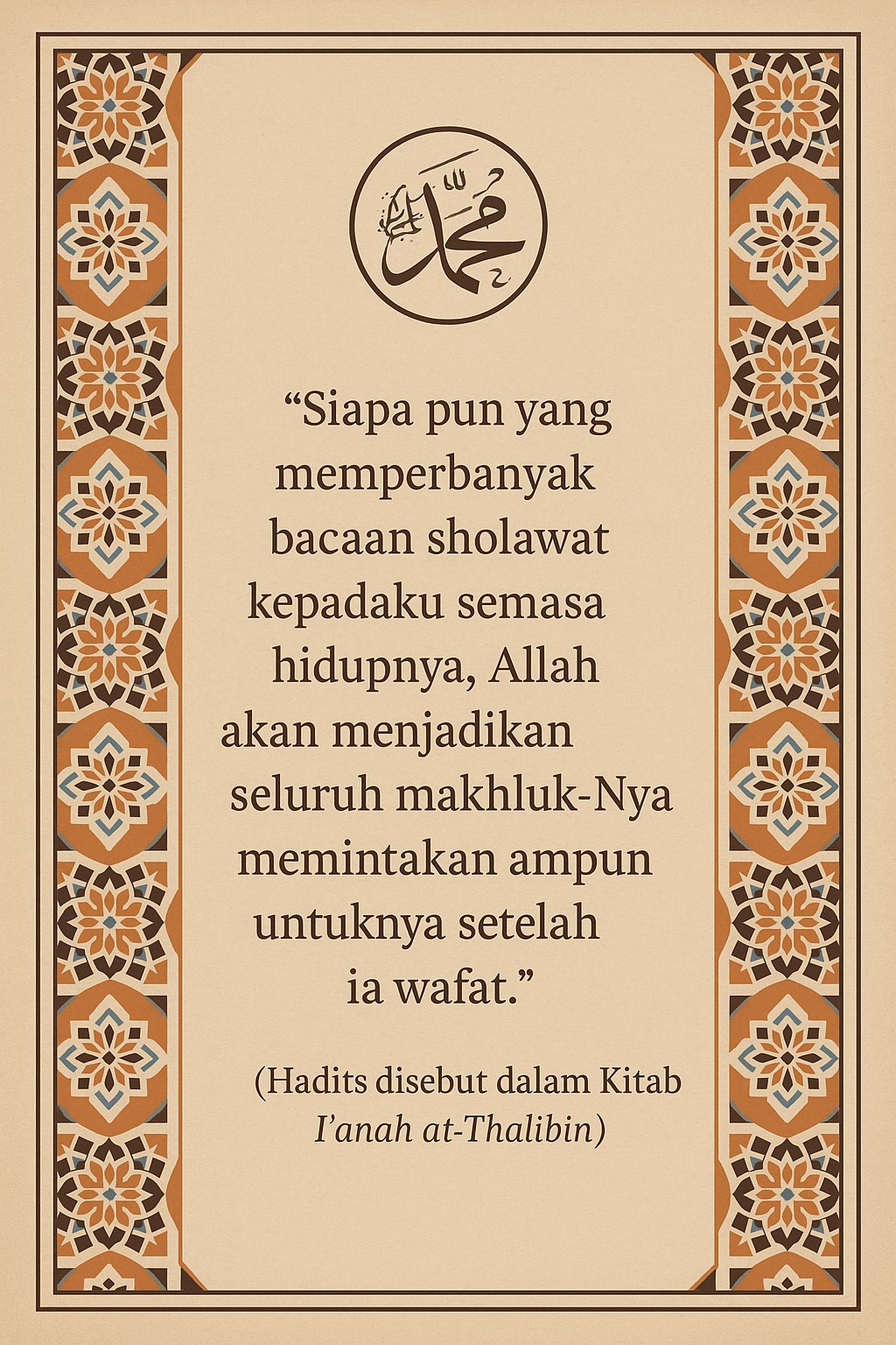 Sayyid Abu Bakar Syatha dalam Kifayatul Atqiya menegaskan bahwa mengingat Nabi dengan sholawat adalah sebab hidupnya hati dan tenangnya jiwa. Maka menuliskan namanya—dengan adab dan cinta—adalah bentuk nyata dari mahabbah yang bersemi dalam dada.